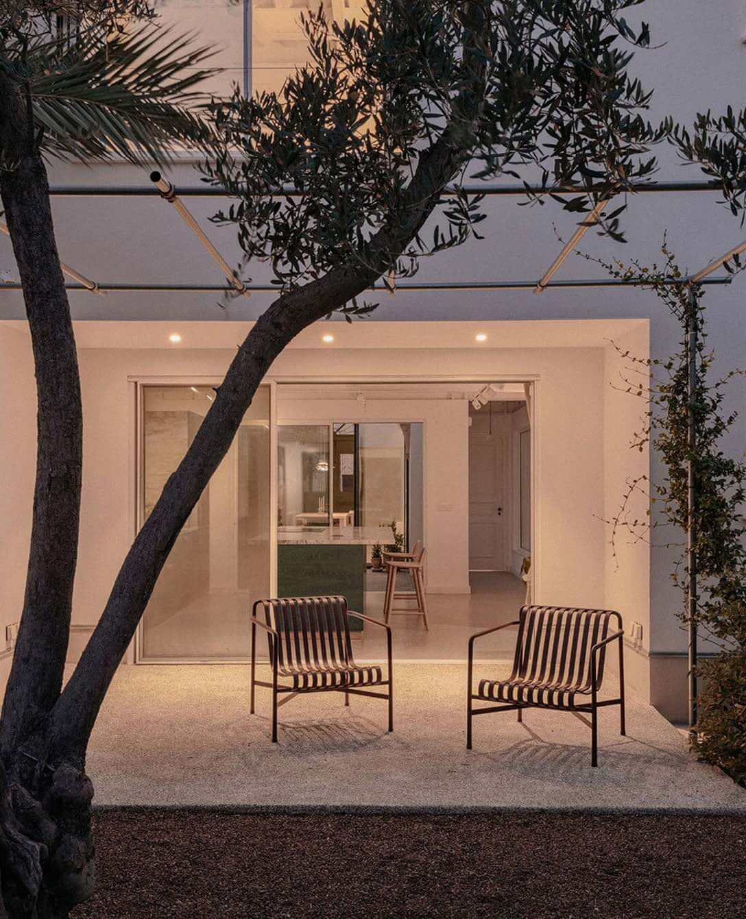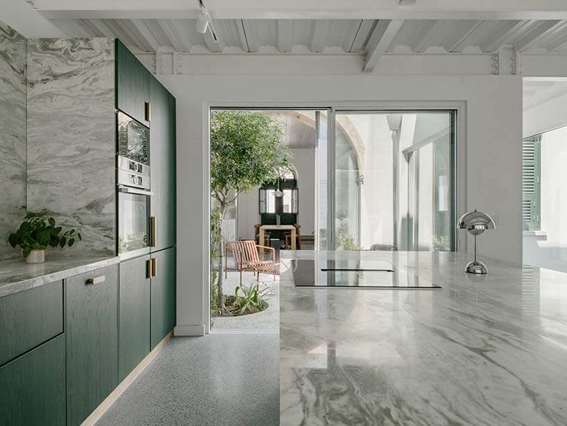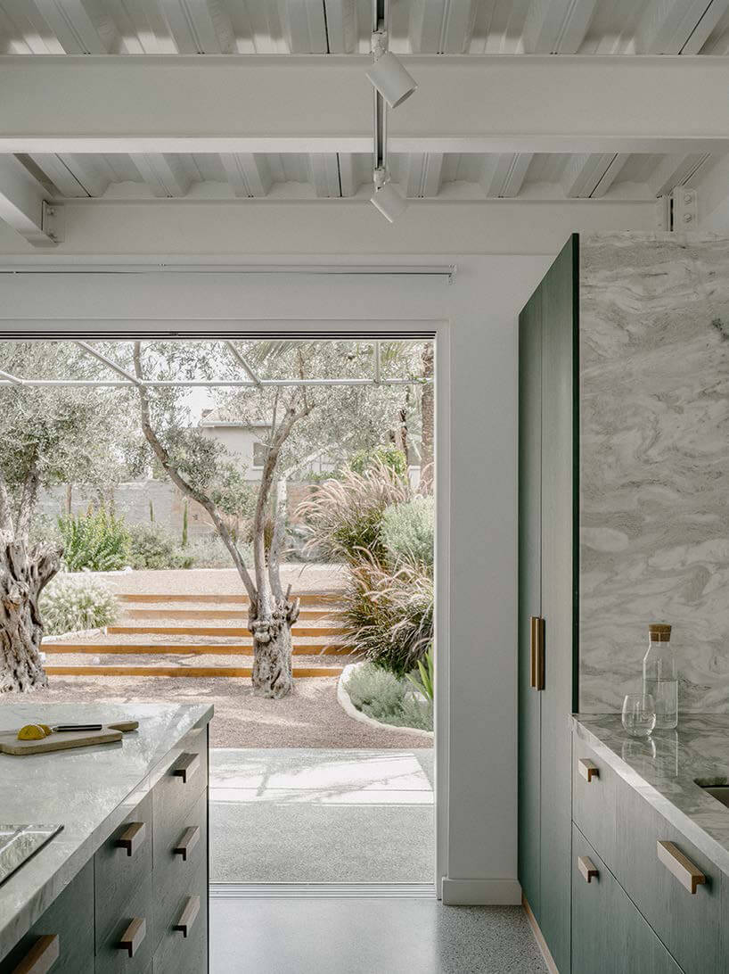 Για τη δημιουργία αρμονίας μεταξύ της ιστορικής κατασκευής και της προσθήκης, η ομάδα σχεδιασμού ενσωμάτωσε χρώματα από το αρχικό κτίριο στα τελειώματα της επέκτασης, συμπεριλαμβανομένων των δαπέδων από terrazzo, των λεπτομερειών της σκάλας, των στοιχείων των μπάνιων και του σχεδιασμού της κουζίνας. Μεγάλα ανοίγματα σε τέσσερις λειτουργικές όψεις συνδέουν τους εσωτερικούς και εξωτερικούς χώρους, παρέχοντας ανεμπόδιστη θέα από την κύρια είσοδο έως τον πίσω κήπο. Ο σχεδιασμός ενισχύει τις χωρικές μεταβάσεις, ενσωματώνοντας το φυσικό φως και το περιβάλλον τοπίο ως αναπόσπαστα στοιχεία της κατοικίας.