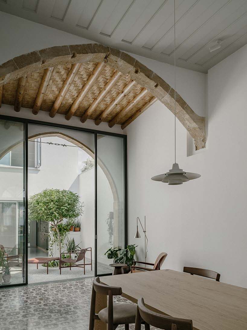 Ο κύριος χώρος εισόδου επαναχρησιμοποιήθηκε ως τραπεζαρία, ενώ τα γειτονικά δωμάτια μετατράπηκαν σε καθιστικό και γραφείο. Μια επέκταση στο πίσω μέρος φιλοξενεί μια ευρύχωρη κουζίνα, χώρο πλυντηρίου και μπάνιο επισκεπτών στο ισόγειο, με δύο υπνοδωμάτια και ένα μπάνιο στον πρώτο όροφο. Διατηρήθηκε σαφής διάκριση μεταξύ παλαιού και νέου τόσο στη μορφή όσο και στην υλικότητα, με έναν διάδρομο να γεφυρώνει τους δύο όγκους και να δημιουργεί δύο εσωτερικές αυλές. Κατασκευασμένη με μεταλλικό σκελετό, η επέκταση διαθέτει εμφανείς δοκούς που ενισχύουν την αίσθηση του χώρου.