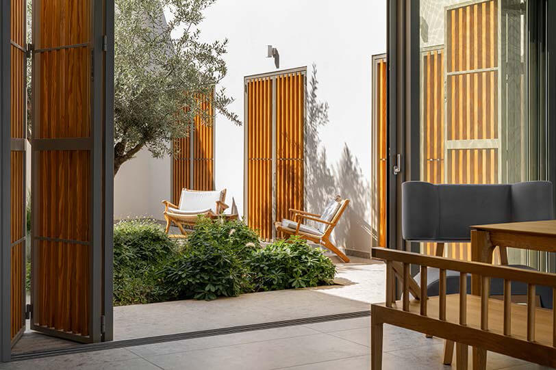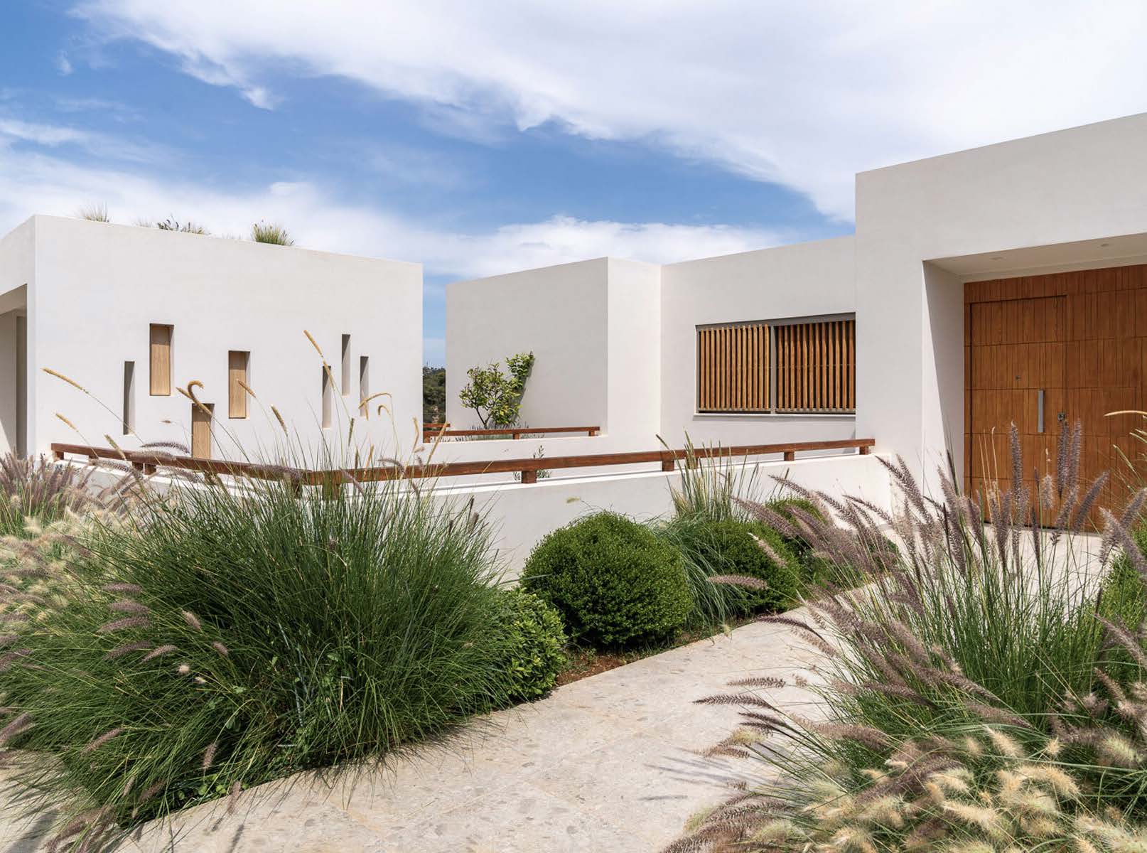 Η χωρική διάταξη ορίζεται από την ανοιχτότητα προς τη θάλασσα και τις πολυεπίπεδες συνδέσεις με το τοπίο. Το ισόγειο λειτουργεί ως η κοινωνική καρδιά του σπιτιού, με ανοιχτή κάτοψη κουζίνας, τραπεζαρίας και καθιστικού. Μεγάλα υαλοστάσια επεκτείνουν τη θέα προς το νερό και δημιουργούν συνέχεια μεταξύ των εσωτερικών χώρων, της πισίνας και των εξωτερικών lounge περιοχών. Μια δεύτερη άνοιξη οδηγεί σε μια εσωτερική αυλή, προσφέροντας μια πιο ήσυχη, περίκλειστη ατμόσφαιρα. Οι βοηθητικές λειτουργίες είναι ενσωματωμένες στην πλαγιά, διατηρώντας τη σαφήνεια της κατασκευασμένης μορφής. Το ανώτερο επίπεδο περιλαμβάνει τρία υπνοδωμάτια με en-suite μπάνια, το καθένα προσανατολισμένο προς το φυσικό φως και τις θέες του περιβάλλοντος. Μια γλυπτική ξύλινη σκάλα συνδέει τα δύο επίπεδα και προσφέρει μια κατακόρυφη μετάβαση μέσα στο σπίτι. Ένα ξεχωριστό τμήμα φιλοξενίας βρίσκεται κατά μήκος ενός μονοπατιού στον κήπο, στεγάζοντας δύο επιπλέον υπνοδωμάτια και ένα κοινό μπάνιο. Αυτή η διάταξη επιτρέπει την ιδιωτικότητα των επισκεπτών ενώ διατηρεί την εγγύτητα στους κύριους χώρους διαβίωσης.