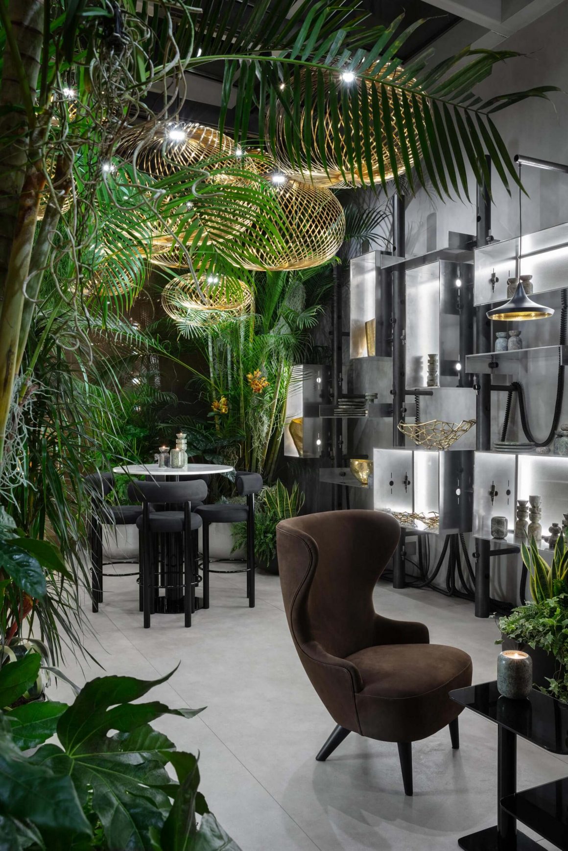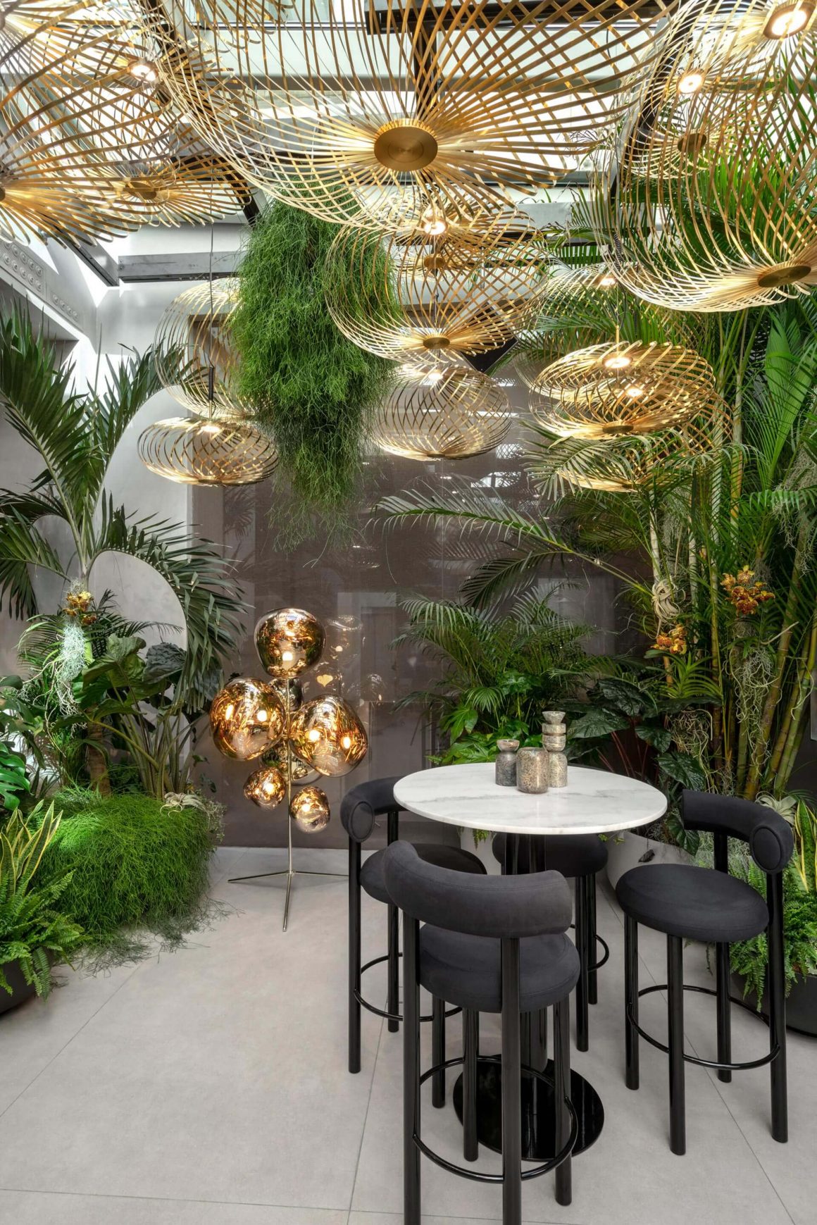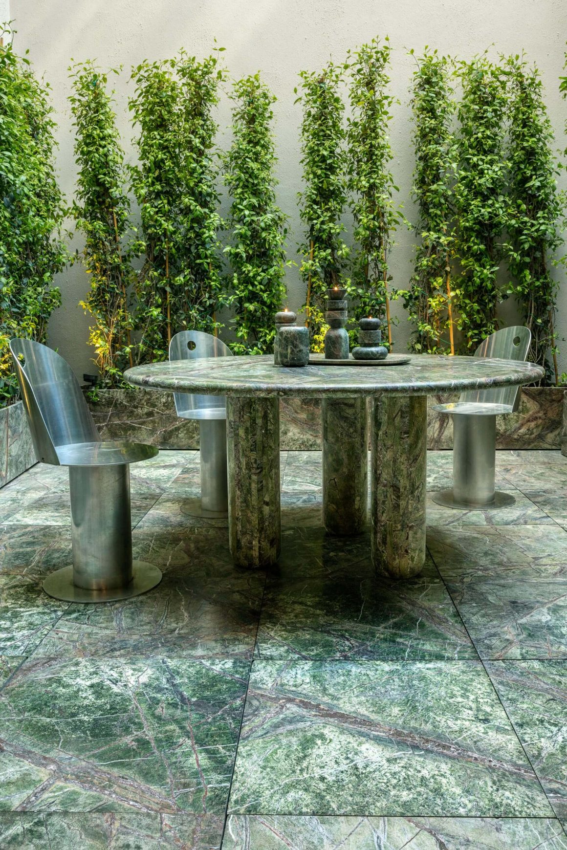 Disrupting the monochromatic theme is a dense jungle of greenery in the gallery, supplied by luxury Sardinian florist, Art Flowers Gallery. Palms and vines flourish from spun aluminium planters and cluster together to create a wild overgrown oasis. In the centre of The Manzoni is a courtyard, which features a custom-made forest green marble table designed by Testi and JKL Design Studio. The marble is brought to life by the lavish foliage backdrop.