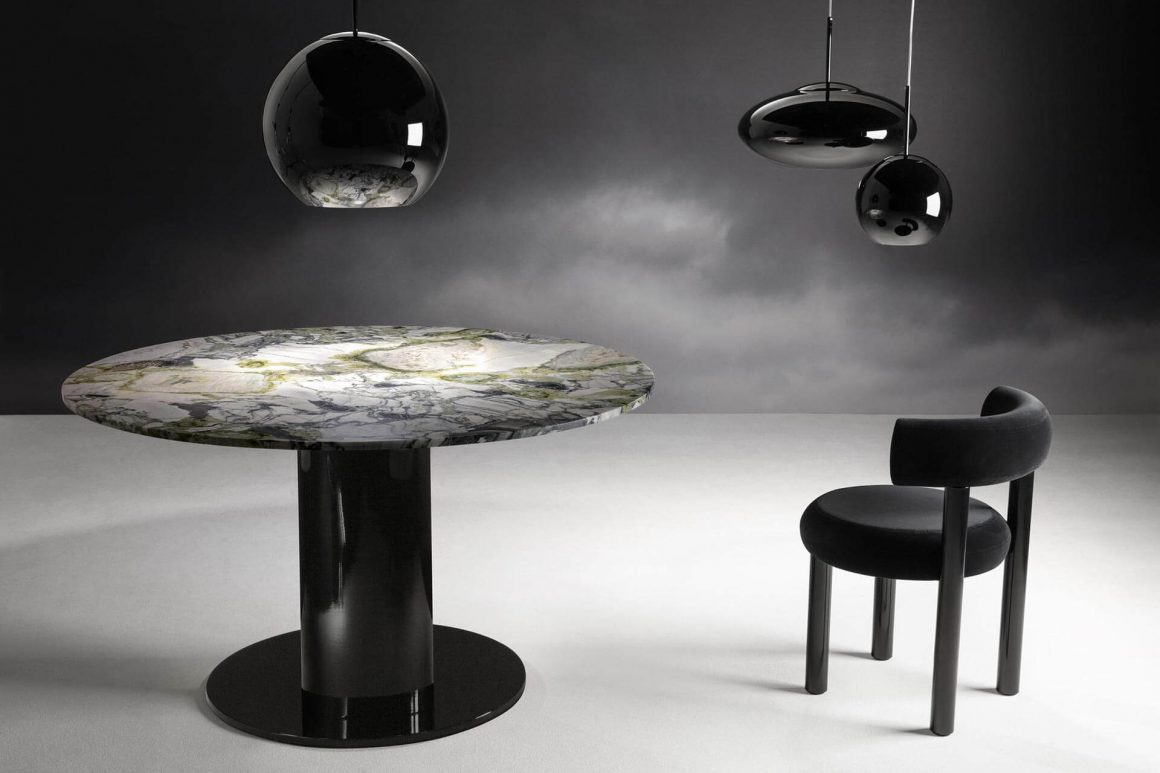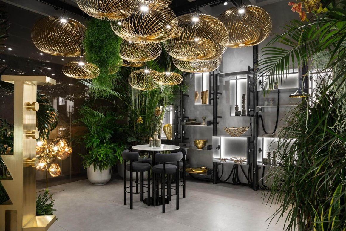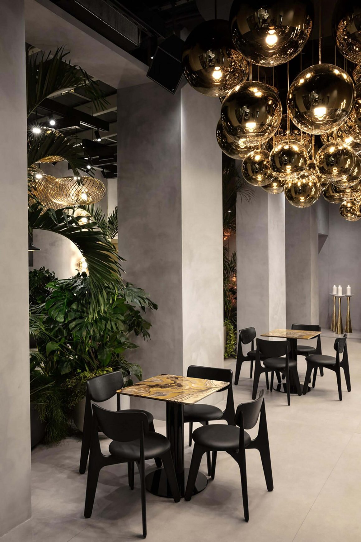 Disrupting the monochromatic theme is a dense jungle of greenery in the gallery, supplied by luxury Sardinian florist, Art Flowers Gallery. Palms and vines flourish from spun aluminium planters and cluster together to create a wild overgrown oasis. In the centre of The Manzoni is a courtyard, which features a custom-made forest green marble table designed by Testi and JKL Design Studio. The marble is brought to life by the lavish foliage backdrop.