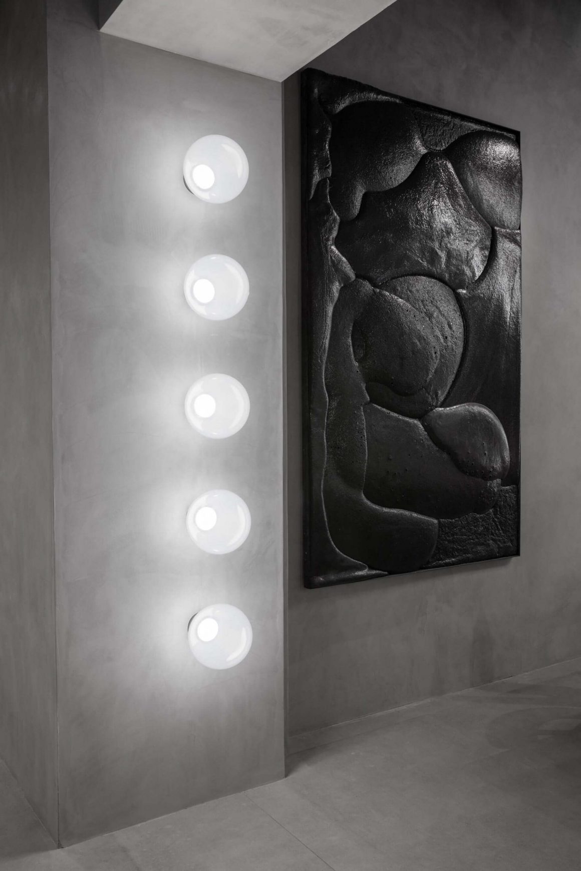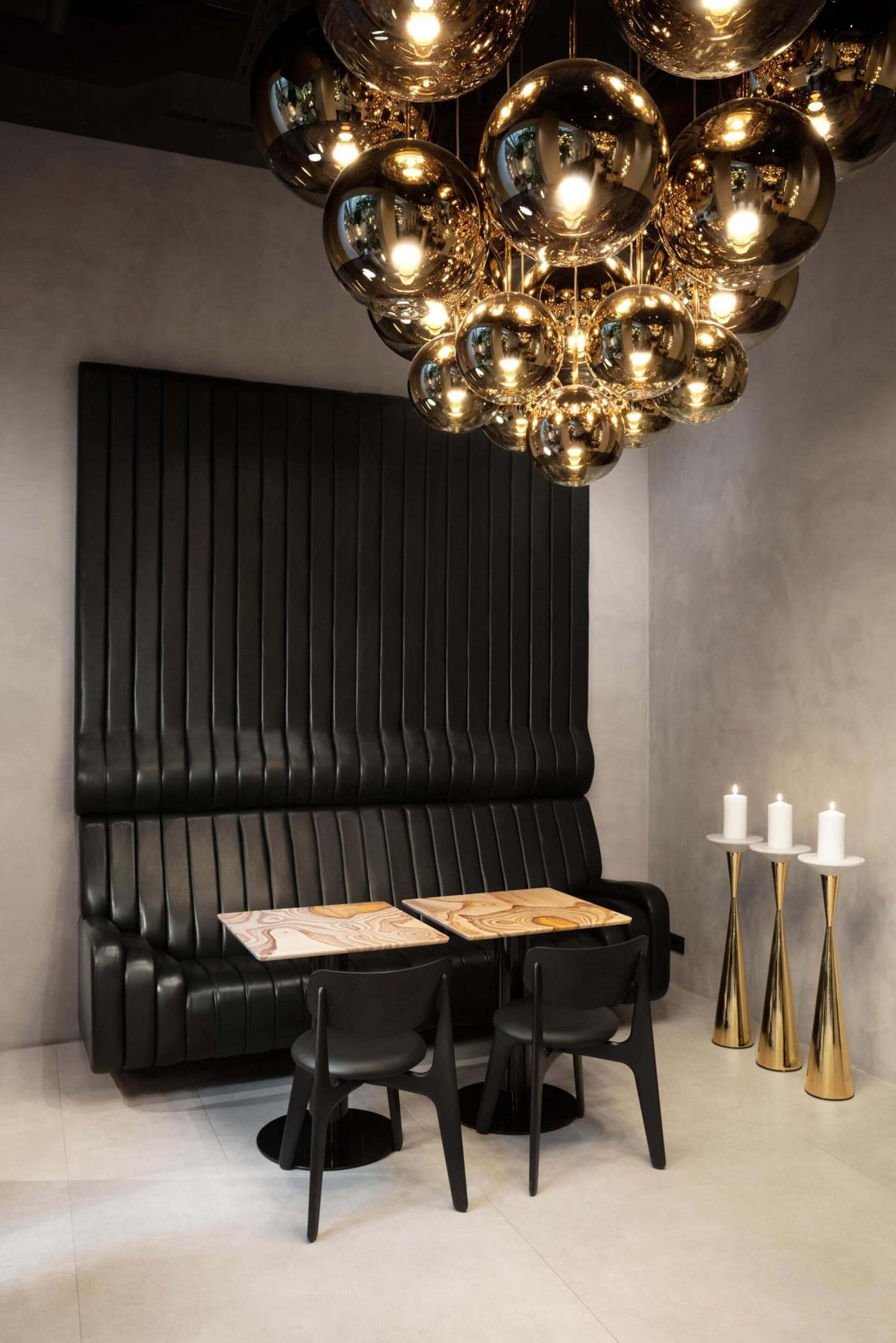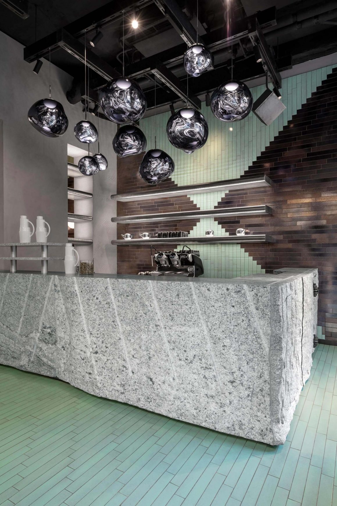 The entrance of The Manzoni features a monolithic block of granite, which serves as the foundation of the bar. Exotic lava stone tiles decorate the wall, which complements the materiality of the Testi stone bar. OPAL, our new lighting range illuminates the space with an ethereal glow.