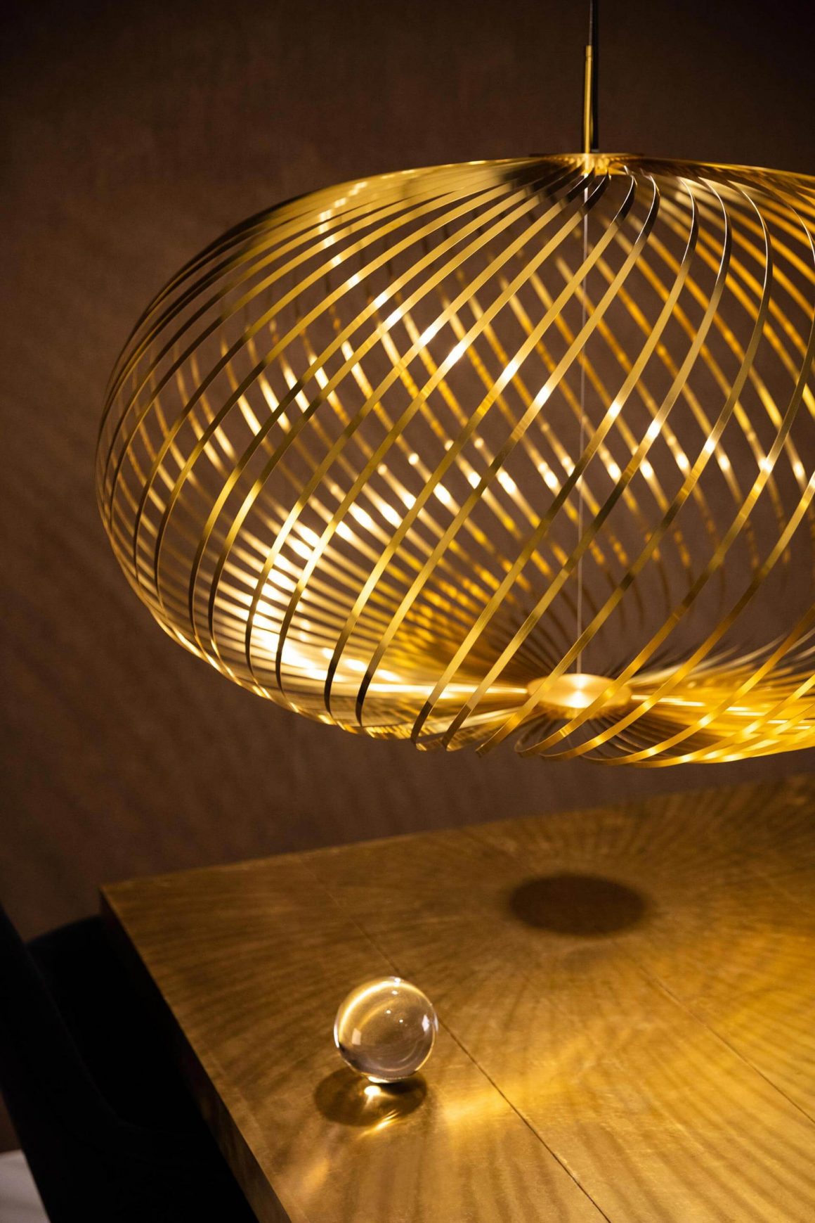 As you move further into the space, the room opens into a long hall featuring monastic cork dining tables, where guests are invited to dine in a communal setting for lunch and dinner. The dining hall is monochromatic with subtle touches of colour coming from the cork and our new Fat dining chairs upholstered in Raf Simons latest collection for Kvadrat. A kinetic installation of spinning SPRING pendants suspends from the ceiling.