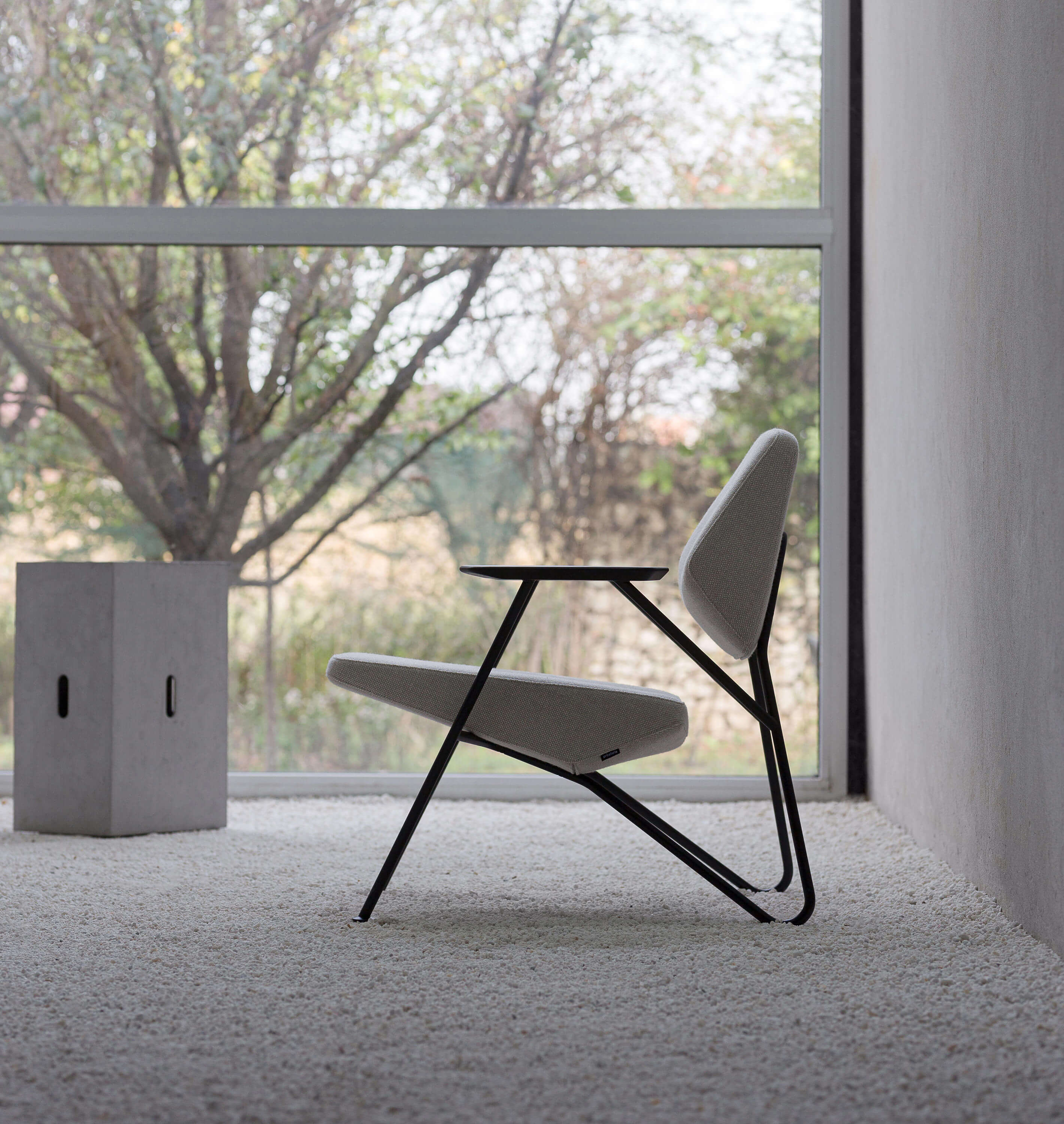 Polygon is an easy chair whose armrests are based on the modernist typology of a seat of modest dimensions. It fulfils the functional parameters but does not usurp spaces that are susceptible to bulk and immobility. Each change in perspective transforms the triangles that define the orthogonal side view of the easy chair, into hexagons and other complex polygons. The end result is a product which seems familiar, even a little old-fashioned, yet is simultaneously distinctly modern. The bent steel rod construction further accentuates Polygon’s duality.