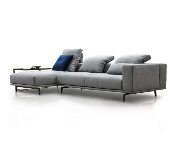 A seating system with several elements, to form different configurations: with or without sides, wide open with no backrest, or enclosed and full of cushions. feather padded backrest cushions. the seat, is in differentiated density foam with feather padding. base in dark brown finish. the back cushions can be placed in various positions; they can be placed lower or higher with the support of the smaller ones which are included in the sofa system. metal legs are in brown finish.