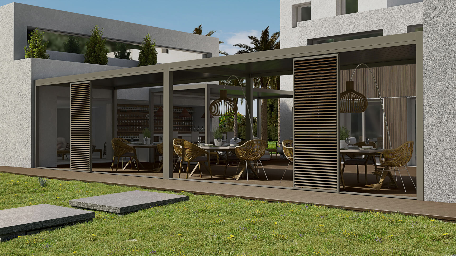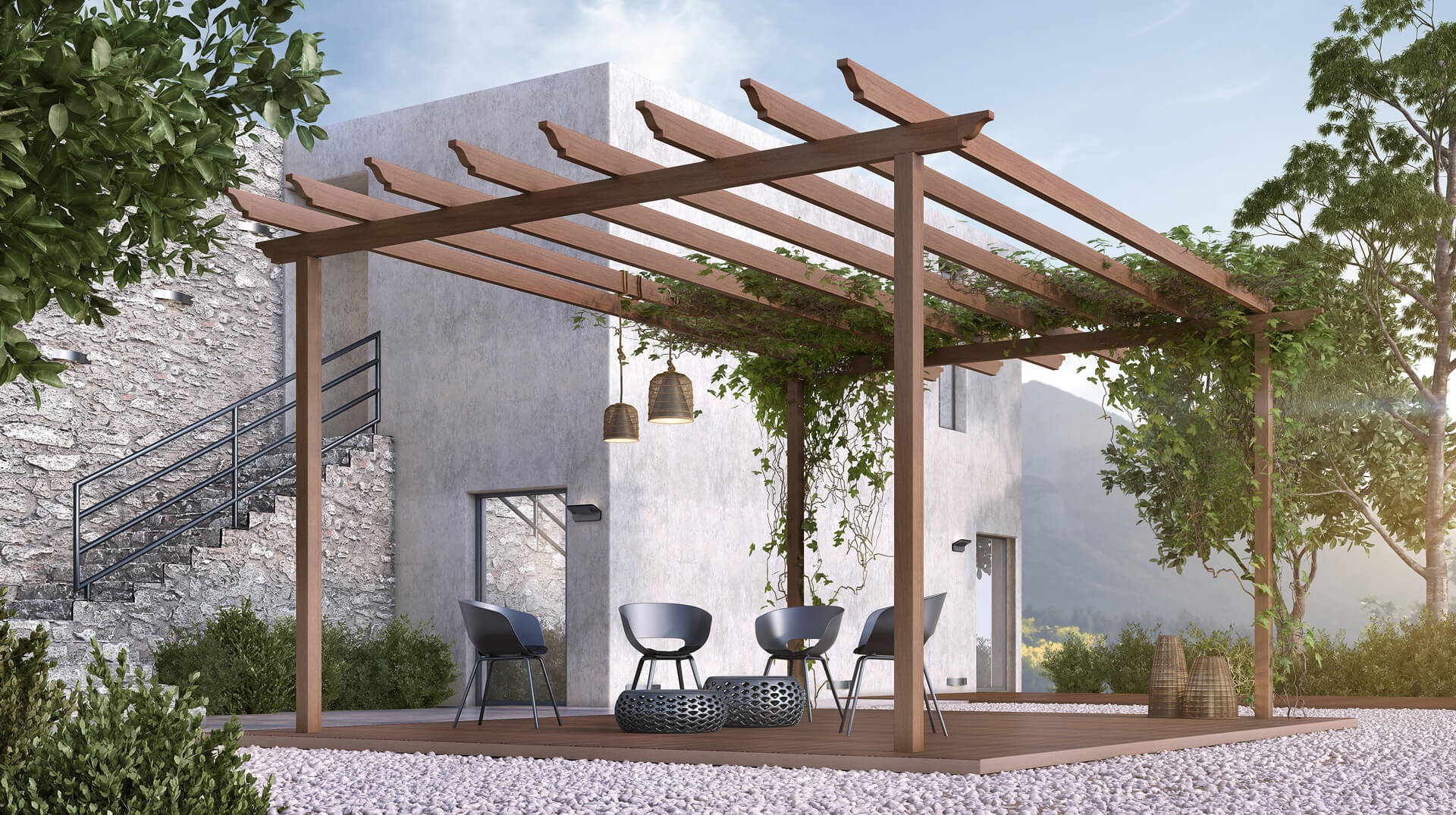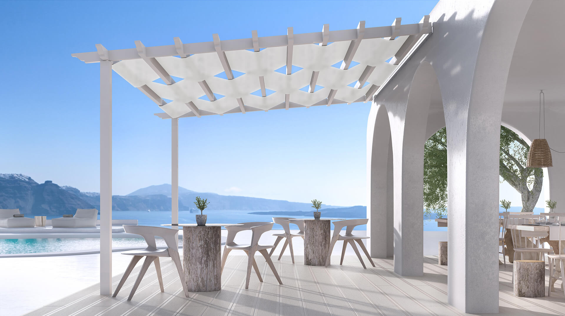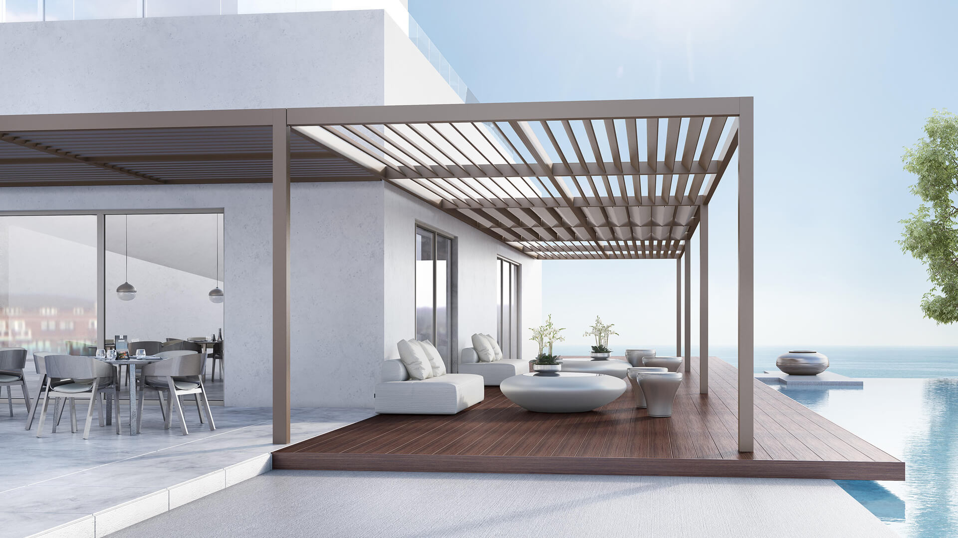 A complete pergola system with fixed louvers for sufficient shading and enhancing of surrounding area aesthetics. Characterised by a wide range of elegant solutions and categorised in four (4) basic models, the minimal Creta, the modern Corfu, the traditional Naxos and the water-sealed Kos.